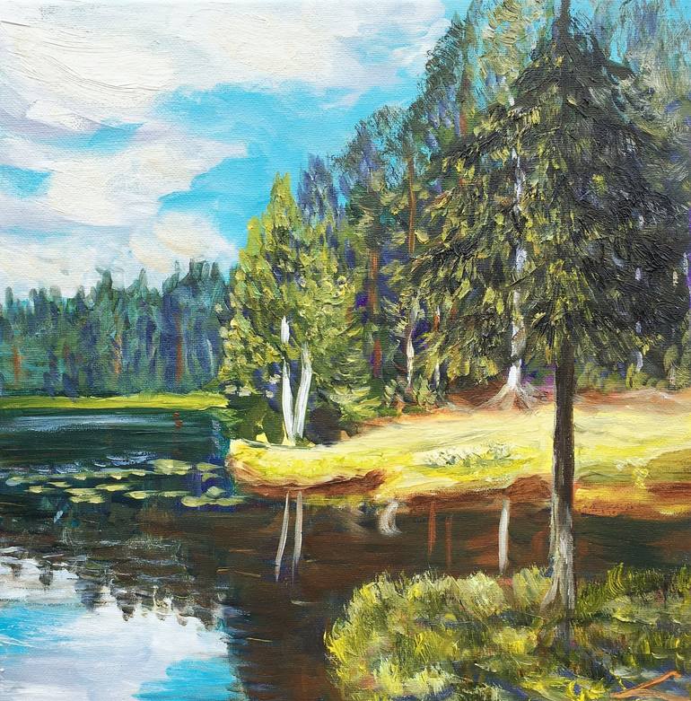 Landscape with a forest lake, studio painting, done after the plain air on the location.