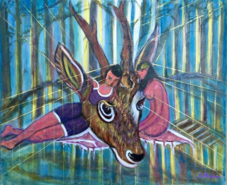 This painting represents vitality, rebirth, fusion with nature, the impulses of life, the beauty of the animal kingdom. The artist's investment in his work is classified more towards intellectuality, the essence, the inner work is oriented more towards the projective, onirisme, poetry, lyricism, ha...