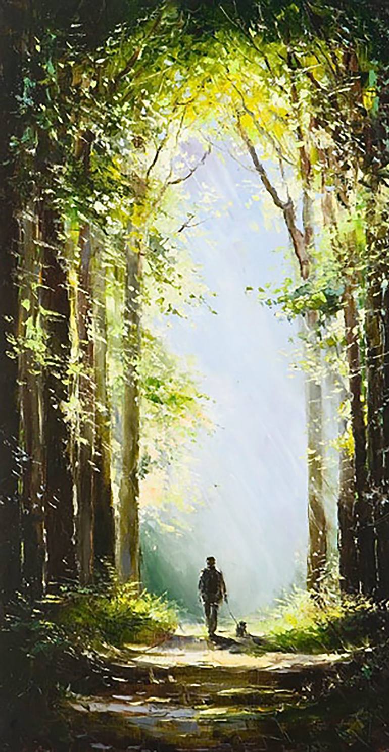 A canopy of trees form the perfect hideaway in this scenic take of a hidden forest. As the trees, carve out a shady walkway, the artist captures a moment stolen with Man's greatest companion. Walking side by side, here is a piece of art that reminisces on, and celebrates the true meaning of friends...