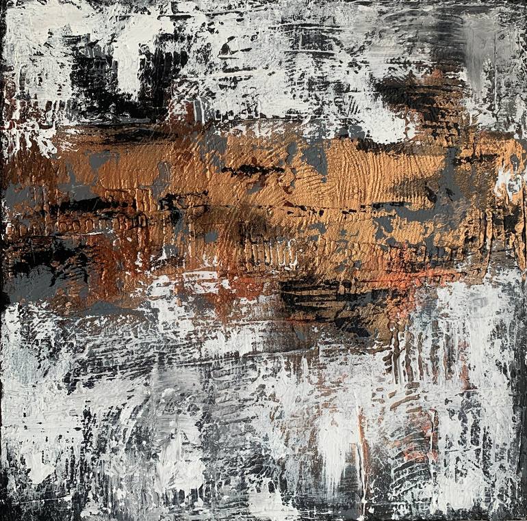 An abstract textured painting, created with multiple layers in bronze, black and white tones, generates a deep and complex texture. The bottom layer of the painting is executed in a bronze color, which produces a metallic surface effect, with a shade that may vary from dark to light. On the top laye...