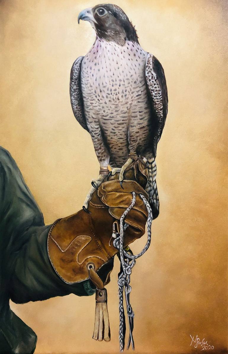 This painting was created in 2021 as a way of expressing the importance of culture in the Arab world, which took about 50 hours, is realistically painted with oil paints Why does the falcon wear glove? These gloves are used by handlers to turn the arm into a suitable perching surface for the bird w...