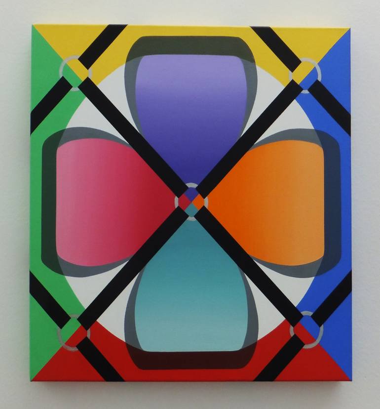 I am presenting a conceptual approach to painting to explore the formal principles of painting. Painted strapping, attachment rings and rivets are combined with random shapes. Besides adding visual stability to the chaotic shapes, the strapping establishes structure within the painting. Continuing the strapping onto the canvas side edges extends the picture plane beyond two dimensions. With the underlying color shapes purposely overlapping the straps within specific areas, spatial illusion is created. Specifically designed strapping plays formality against informality. The overall resulting intrigue challenges one's perception. Purposely aligned color shapes relate to a secured placement and a captured moment.
