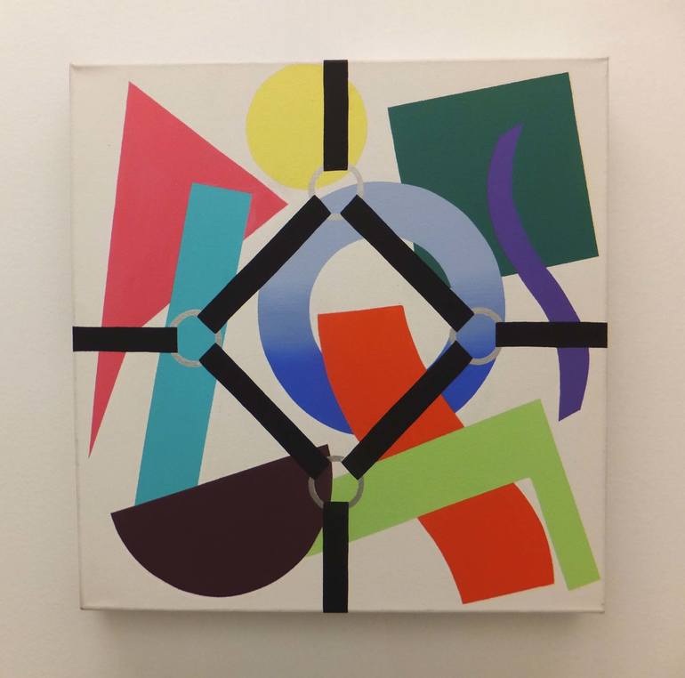 I am presenting a conceptual approach to painting to explore the formal principles of painting. Painted strapping, attachment rings and rivets are combined with random shapes. Besides adding visual stability to the chaotic shapes, the strapping establishes structure within the painting. Continuing the strapping onto the canvas side edges extends the picture plane beyond two dimensions. With the underlying color shapes purposely overlapping the straps within specific areas, spatial illusion is created. Specifically designed strapping plays formality against informality. The overall resulting intrigue challenges one's perception. Purposely aligned color shapes relate to a secured placement and a captured moment.