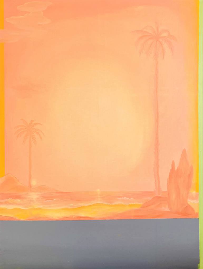This painting exemplifies a sophisticated interplay between abstraction and figuration, depicting an imagined oasis imbued with layers of symbolic meaning. The composition features a tranquil beachscape framed by palm trees, illuminated by the ethereal presence of four suns, whose warm glow permeate...