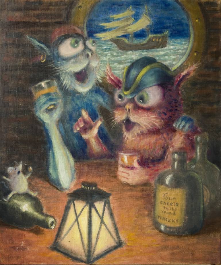 This poor cats a little "four sheets to the wind"... Inspired by Tom Waits songs. This work could be in its place in pub or whisky shop restaurant.