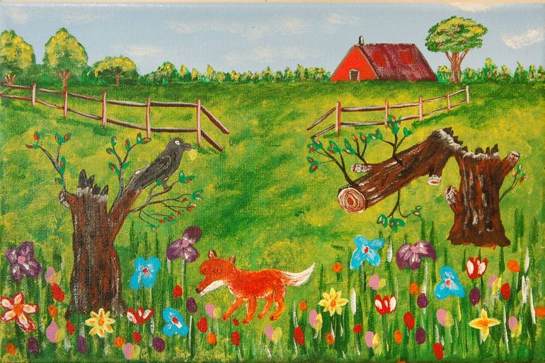 Fox and The Crow Story. Done on Canvas with Acrylic and Varnish . The buyer will get a signed certificate and a photo of the painting and of the artist wow that's me. Thanks for looking . Check out all my paintings please. Import customs tax to the buyers country to be paid by the buyer. Thanks Ken.