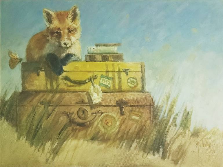 A fun illustration of a fox sitting on the suitcases. It's all about summer travel, and taking the beloved wildlife with you as you reach your beach vacation destination.