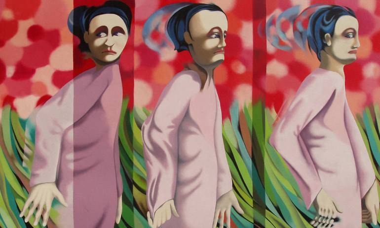 Oil on canvas, 100 x 60 cm. A man walks, he notices something while he is going, then he goes further. The three shots, placed next to each other, partially overlapping, do not tell us what he saw, but do tell us something. Through the man eye we sense that what he saw hit him. Maybe he thinks tha...
