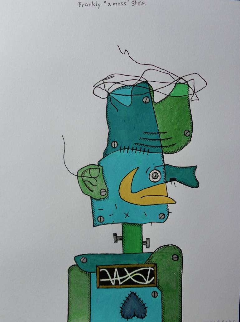 This drawing/painting began as a scribble from my subconscious that turned into a imaginary Frankenstein character that is out of sorts.