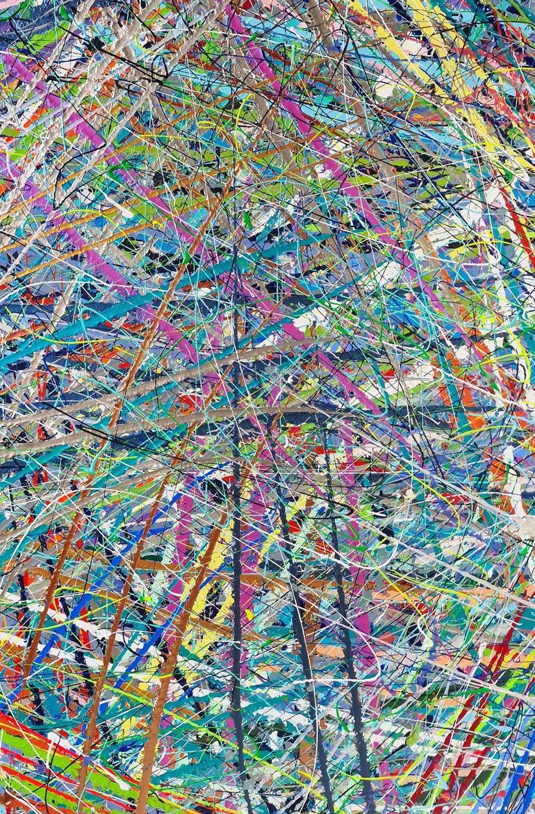 Fantastic abstract canvas made with paints and acrylic enamel in intense colors. Made with a multitude of strokes that reflect speed and color combinations in multiple shades, including gold, purple, yellow, ocean blue, smoke black, mint green, sky blue, violet, titanium white and different meta...