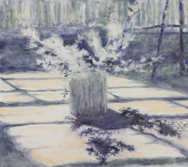 This oil painting is part of the artist's California fire trail series. The flowers in the tin vase are from the invasive (but beautiful) French broom plants scattered across the California foothills near the artist's studio. The bouquet sits on the cement floor of the artist's studio, framed by sha...