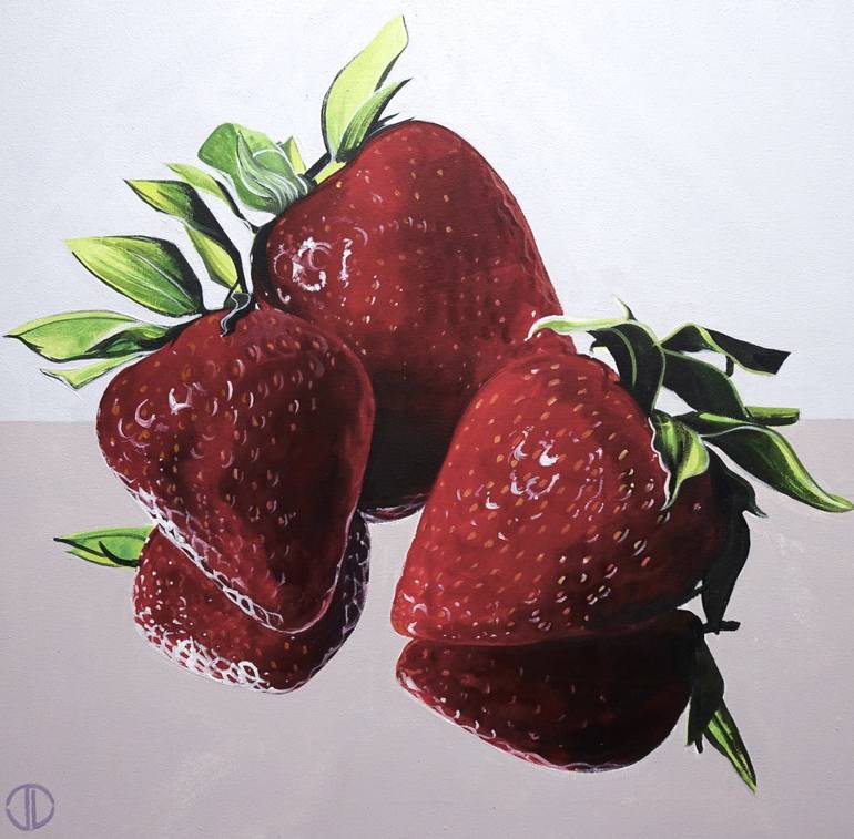 Modern still life realistic painting of fresh strawberries and their reflections on canvas