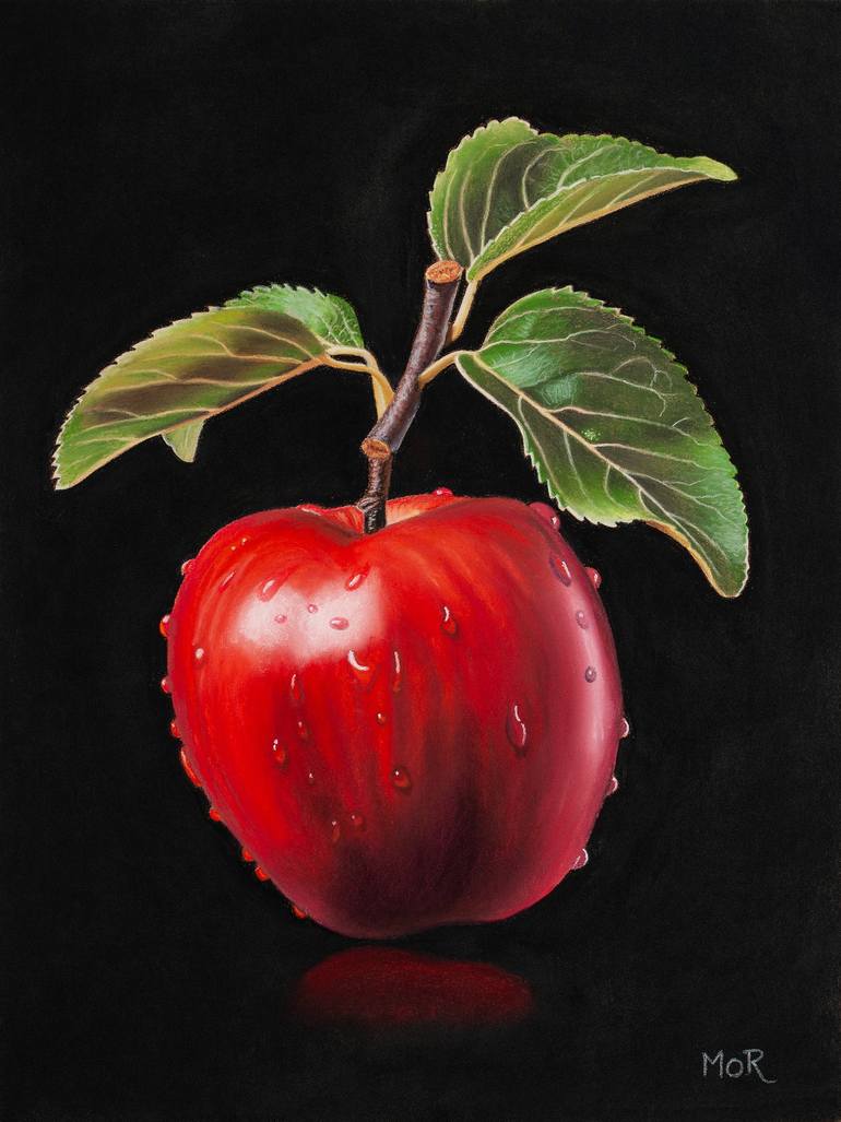 A freshly picked red apple with its stem and some leaves, still wet with waterdrops. Pastel on pastelmat. Shipping via DHL, packed in a transparent sleeve between two layers of lightweight foam board and in a cardboard box. Instructions for proper framing included.