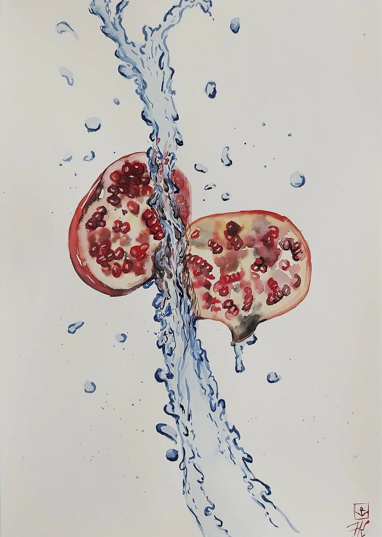 Like a moment before transformation, this watercolor painting carries the symbolism of fragility, abundance, and renewal. The pomegranate—an ancient symbol of passion, life, and hidden wisdom—bursts open, revealing deep ruby-red seeds, as if holding stories of love, sacrifice, and rebirth. A stream ...