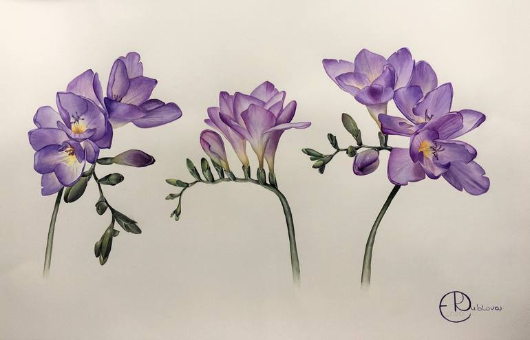 I like to be inspired by flowers. There are lots of flowers which are becoming a center of the art piece. Roses, lilac, peonies, poppies etc. But this is the first time fresia flower to become a hero of my work. I was enjoying doing this work, and going deeper with the violet color with every stage ...