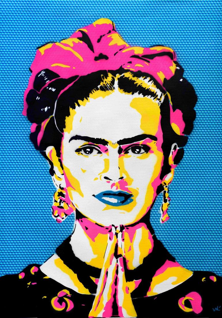 Frida Kahlo Azul 100 x 70 cm – - Acrilic spray paint Edition 26/50 2019 Hand-cuts stencils and spray paint on printed paper. Frida Kahlo is a big icon in México where I'm now living, she was an inspiring painter and I want to give her a tribute with this artwork.