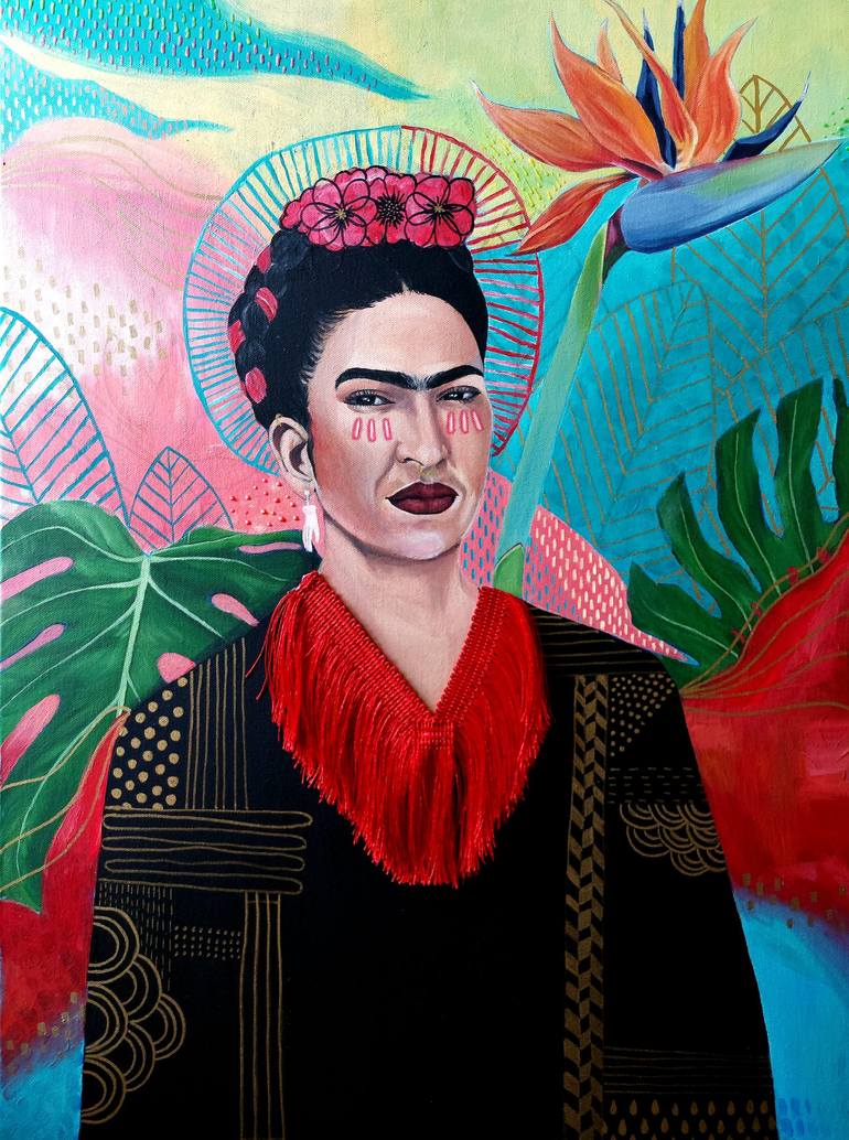 Having learned a bit more about this iconic woman, I felt the urge to create my own representation of her. I imagine her surrounded by colors. I even strayed a bit from my habitual style to incorporate some abstract because I needed a way to bring forth her acknowledged weirdness. The plants are one...