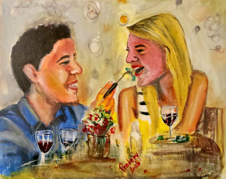 A romantic new couple is having romantic time at the restaurant.