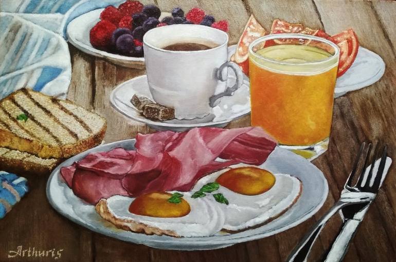 "Fried eggs with ham and coffee" Original art work Oil on canvas 60 x 40 cm fried eggs, eggs with ham, eggs with coffee, mango juice, coffee, berries, dessert