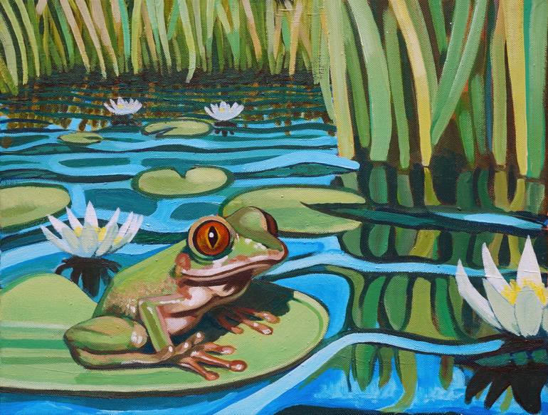 This was done from a using a photo of a tree frog as a reference rather than a species you may expect to be on a lily pad. It was the image of a frog which I liked best. Ii just meant I had to make some adjustments to it's form as it was clinging vertically on a tree in the source image. The backgro...