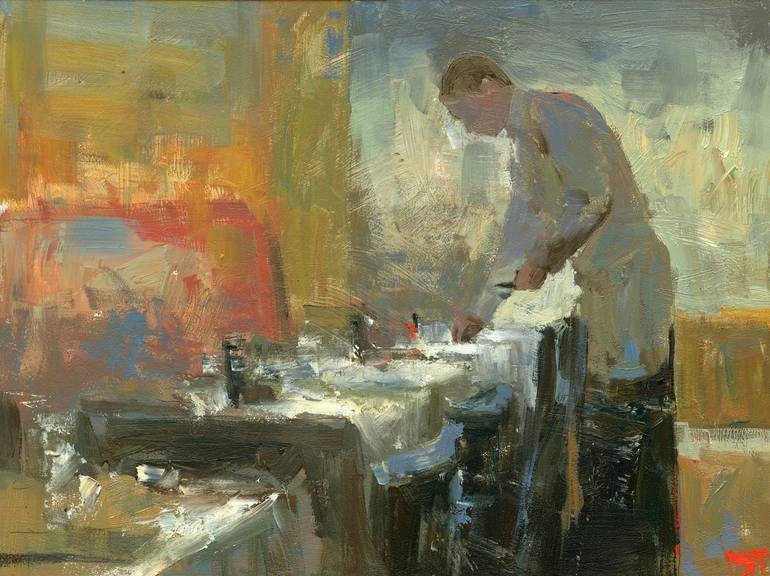 Front of the House is part of a series to do diners, restaurants, and taverns. I use subdued colors and loose brush strokes, as in most of my paintings, in order to create the mood and feel of an urban setting. Art buyers may see a symbolic reference to prominent 20th century American painters like ...
