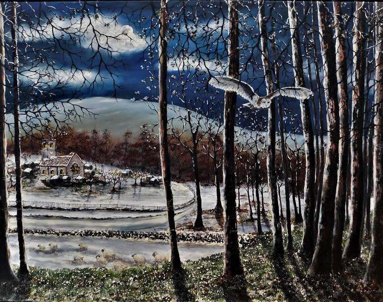 Award winning illustration of a small welsh village , many years ago when the snow is thick on the ground and the clock is striking midnight. Textured and layered , with pallet knife and brush.