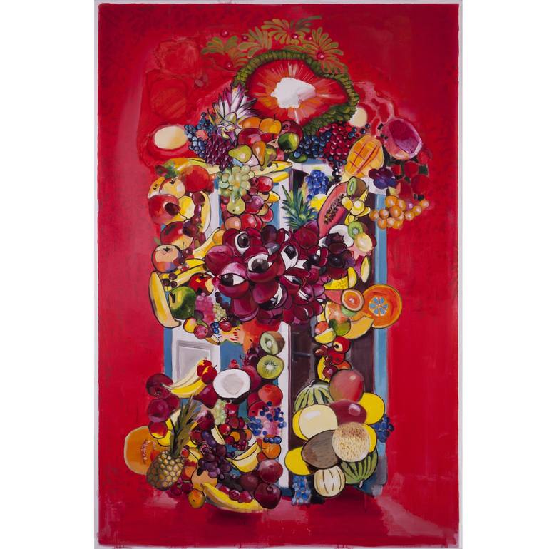 The painting before you is a vibrant and saturated celebration of tropical fruits, depicting a wide array of papaya, melon, cantaloupe, apple, banana, pineapple, and more. The fruits are arranged in a box that is overflowing with abundance, the colors and textures blending together in a riotous disp...