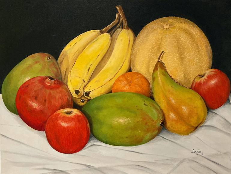 This captivating oil painting bursts with the richness of a tropical harvest. Bananas, melon, and mangos radiate golden hues, while pomegranate, apples, pears, and tangerine offer vibrant splashes of colour. Each fruit is rendered with lush detail, creating a harmonious celebration of nature’s sweet...