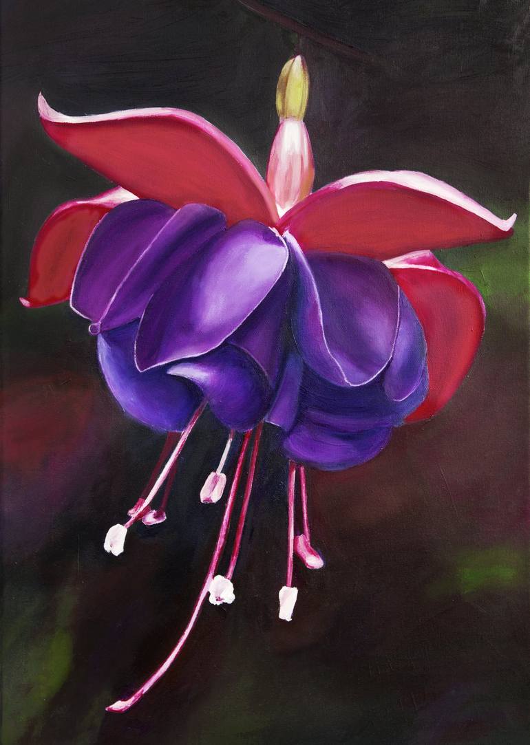 This painting captures one of nature’s most elegant flowers — the fuchsia — rendered in rich, vibrant shades of purple, magenta, and crimson. The voluminous petals seem to glow against a deep, dark background, highlighting the flower’s delicate and refined form. Every detail is painted with a deep ...