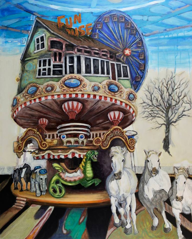 This is part of a series of paintings, Fun House. The ideas I'm exploring include how we relate to nature through the architecture we create. Primarily I'm mixing up and recombining images from different aspects of our lives that we usually keep separated. For example, residential and entertainme...