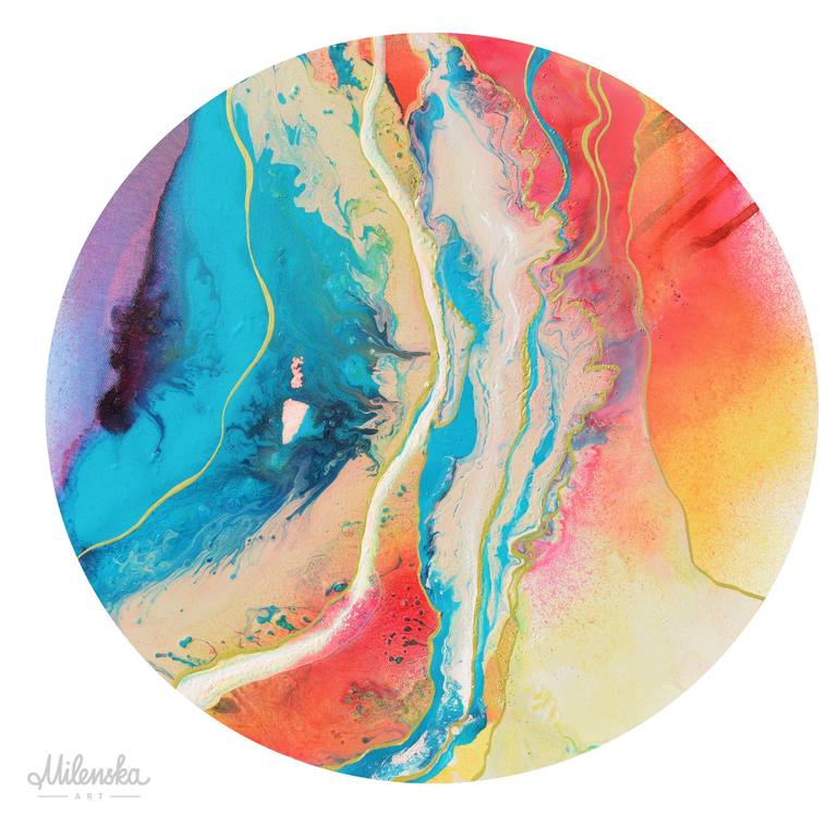 INSPIRATION I was looking at NASA'S space photography and being inspired to create bright colored piece with more graphic details. I mixed styles and mediums. My idea is to show imaginary view from other world looked through a telescope. Title: Fusion 2 Size: 50 cm diameter, depth: 2 cm Year: 2022 ...