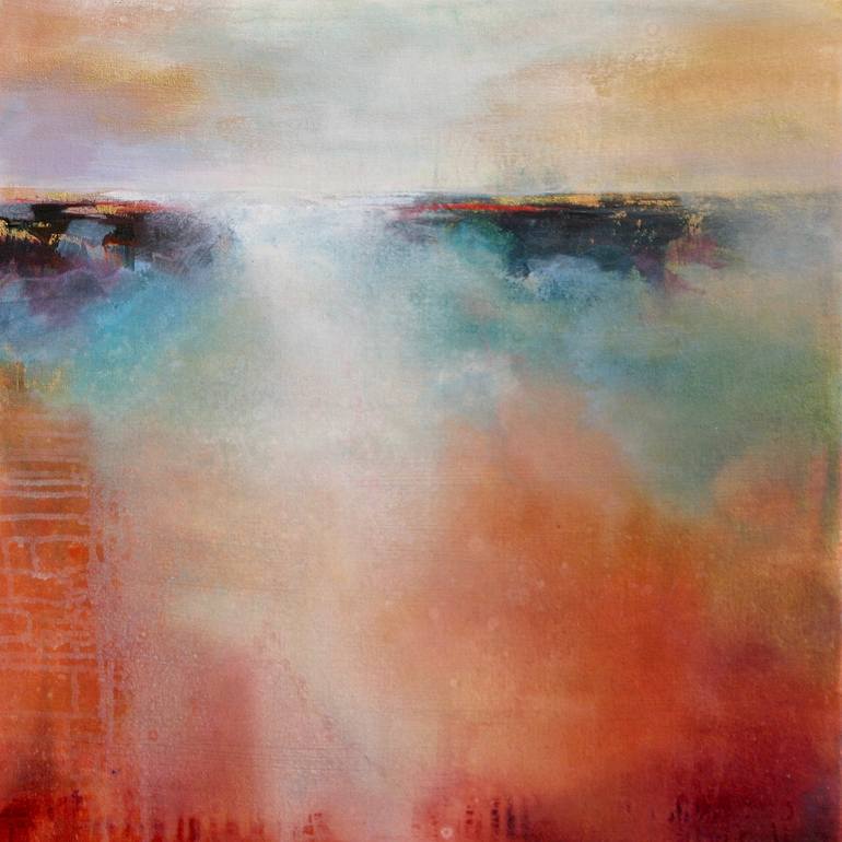 This original abstract landscape is presented on a gallery wrapped canvas. There are 10+ layers of acrylic paint, washes and glazes that give the piece depth and interest. This particular painting has an underpainting of metallic gold which peeks through to give the artwork luminance and vitality...