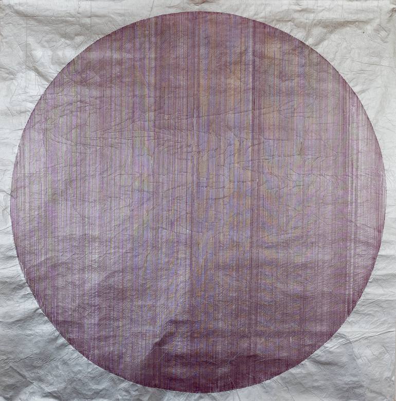 G100S-01 Large circle over silver background. Each painting is unique and handmade. To be hung between 2 slightly larger sized sheets of plexiglass with perforations in the corners at 1cm distance to the wall. Works on silk paper with water color and ink. All has its origin in the script, the writt...