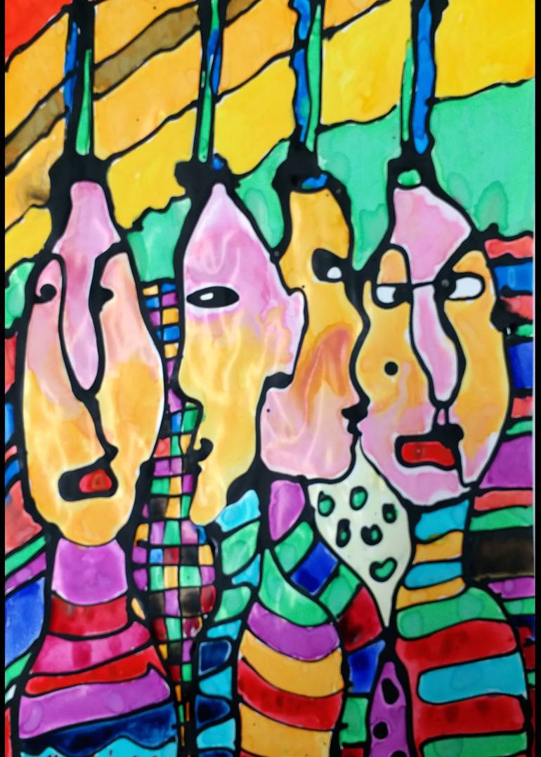 Connected faces with tubes and a variety of colors and backgrounds and stripes, with some inspiration from HUNDERTWASSER.