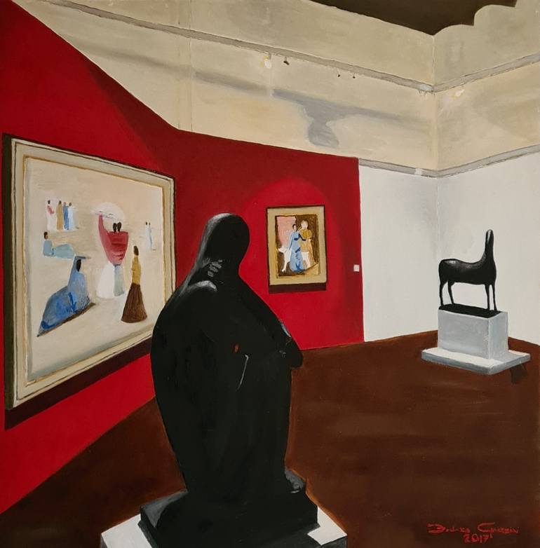 I painted one of the museum rooms of the Galleria d'Arte Moderna (GAM) in Rome. Inside there are two bronzes by Marino Marini, the crouched man in the foreground and the horse in the background. On the red panel two paintings by Massimo Campigli. GAM was exhibited in Turin-Palazzo Birago on the occa...