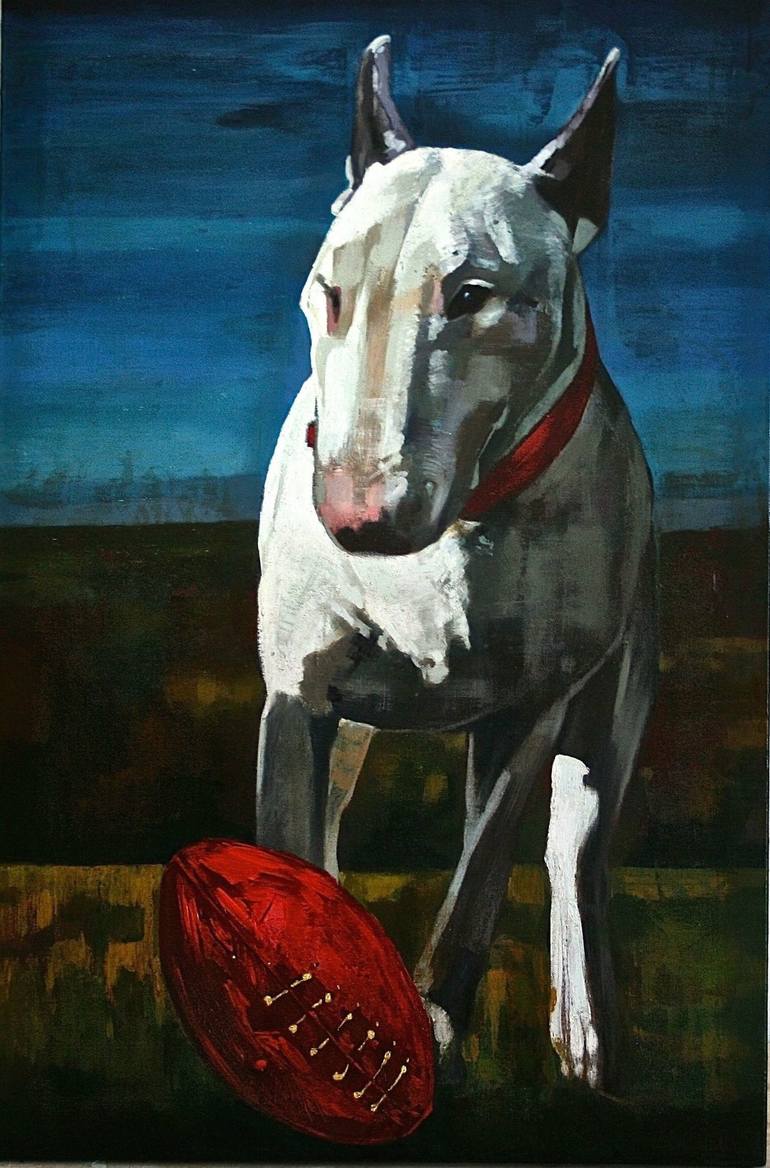 La tête ovoïde du Bull Terrier et la forme du ballon de rugby. The ovoid head of the Bull Terrier and the shape of the rugby ball. Série peinture animalière. Animal painting series. Bull Terrier series. Les chiens sont célèbres, eux aussi, mais ils ne le savent pas. Sinon, ils seraient encore plus c...