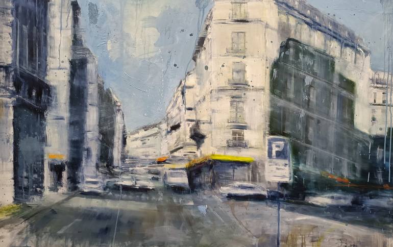 the painting tells the story of daily life in our cities, with traffic and its contrasts of light and shadow