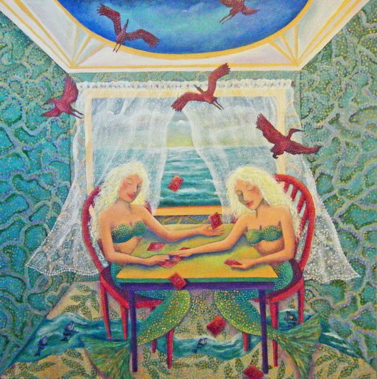 MERMAIDS ARE PLAYING CARDS IN THEIR HOME WITH A WATER FLOOR AND FISH IN THE WATER. Image wraps around all edges and does not require a frame.