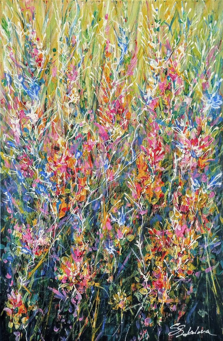 I didn’t just paint flowers—I painted their laughter, their whispers in the wind. Every brushstroke is a movement, every splash of color a melody. The golden background glows like warm sunlight, embracing the wild pinks, blues, and yellows that burst forward, tangled in playful lines. It’s chaos, bu...