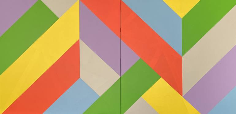 A large-scale contemporary work of dynamic and muted colors arranged in sharp angles and contrasting colors that provide a rhythmic and intriguing visual landscape for the mind.