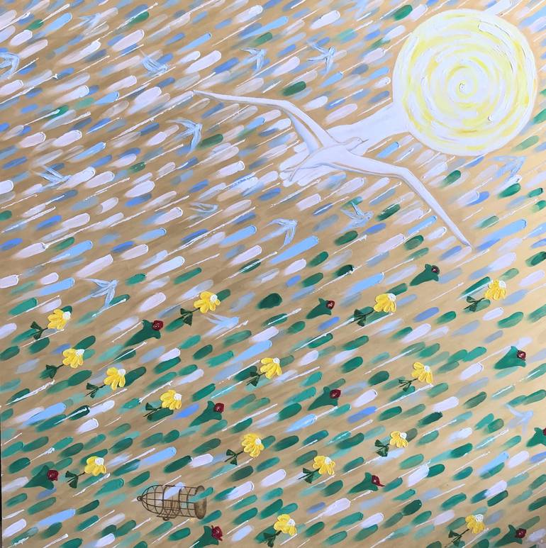 This painting is an instrument of love to help you open the eyes, beyond any illusion. It also can indicate a deep state of trust. "Inner and outer" Solar wind. Current of love. Illusion of the cage. Go inside and see. Go "outside" and it is the same. Fly freely. Flow in the stream of life. Light ev...