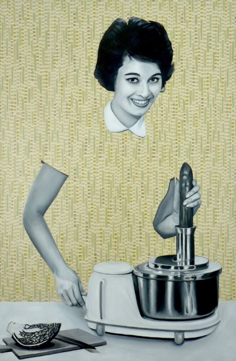 Original oil painting on vintage wallpaper mounted on stretched canvas. Bernadette Slicing Cucumber is painting number 95 of the series "Disappearing Housewives". In this series I paint women more or less disappearing in, or dissolving with the background/wallpaper while tending to housework. The se...
