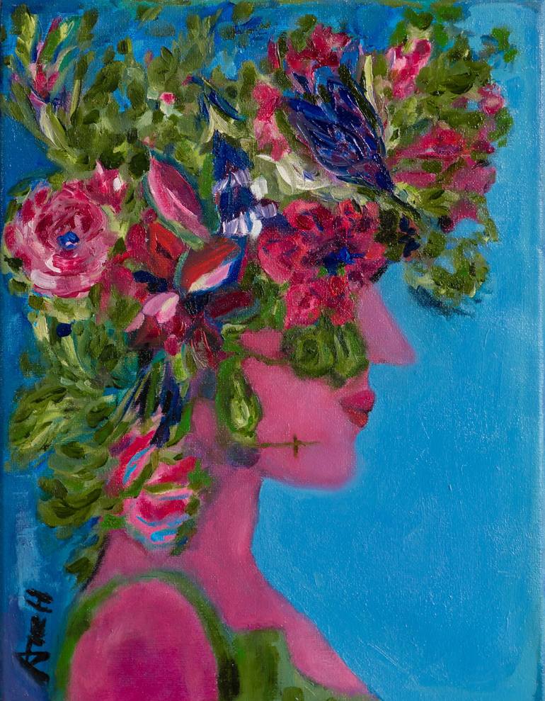 This painting by Ane Howard features a vibrant and colorful portrayal of a woman's profile that blends seamlessly into lush floral elements. The woman's face and upper body are painted in shades of pink, creating a surreal and dreamlike appearance. Her hair is composed of an array of vividly painted...