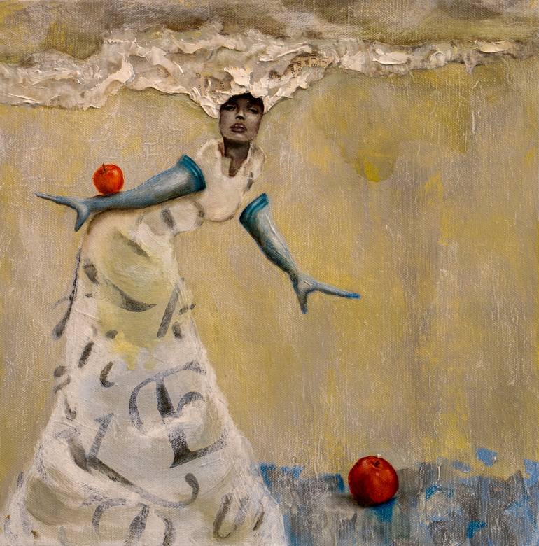 This is a Abstract Expressionism mixed medium painting of a surreal composition features a woman with an elongated gown, reaching out with gracefully extended arms. Two vivid red apples add a striking contrast against the muted background. I was inspired by the gentle sway of contemporary dancers.