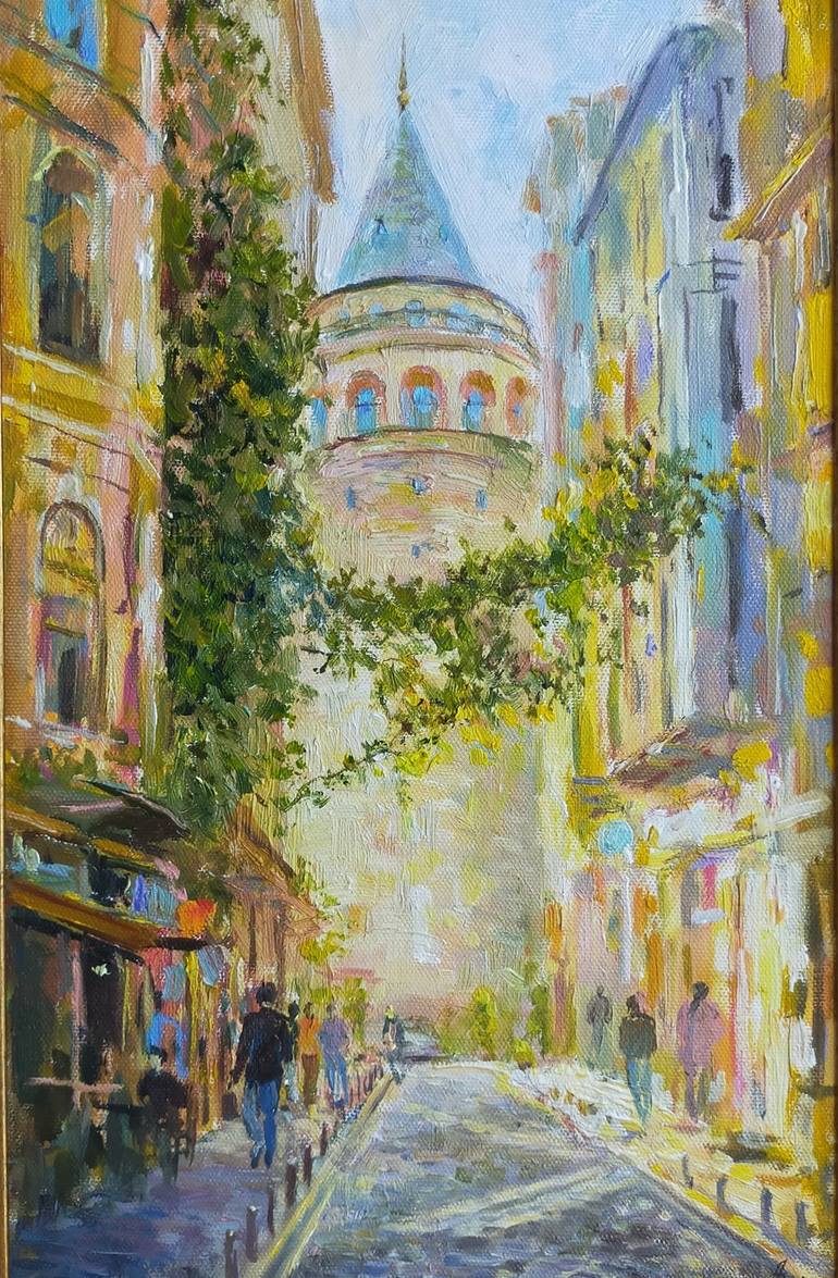 Galata Tower in Istanbul, an original painting on canvas. The painting depicts an urban landscape with the Galata Tower in the center of a narrow street. Sunlight falls on the tower. Plants hang from both sides of the houses, which are intertwined all the way to the tower. People walk along a rocky ...