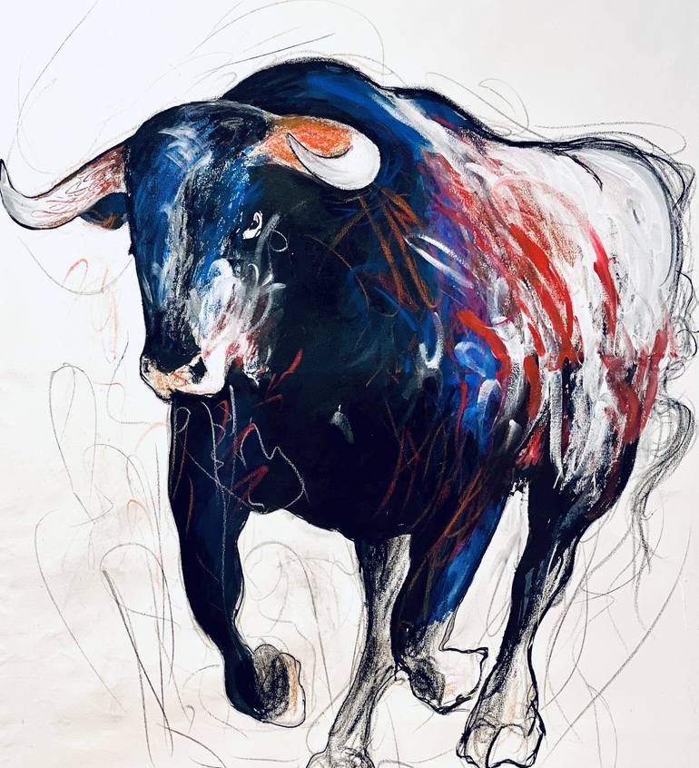 This mixed media on stretched canvas painting is the biggest bull I've done so far - 140 x 110cm. It is part of a series set to be exhibited in Dallas, Texas at The Other Art Fair by Saatchi in May 2022. I have always wanted to (and one day will) create a life-sized bull. Bulls have always been kn...