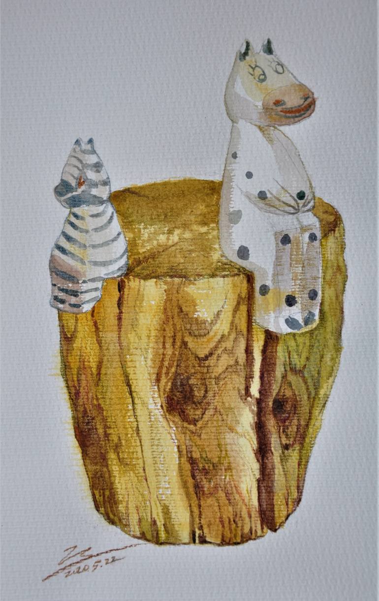 Inspired by that cat and cow sit back to back on the cracked wood. It highlights that removing communication gap is a key for achieving individual & collective freedom. I choose the natural watercolor on the paper for the free flowing in limited 3D space, which implies freedom without communication ...