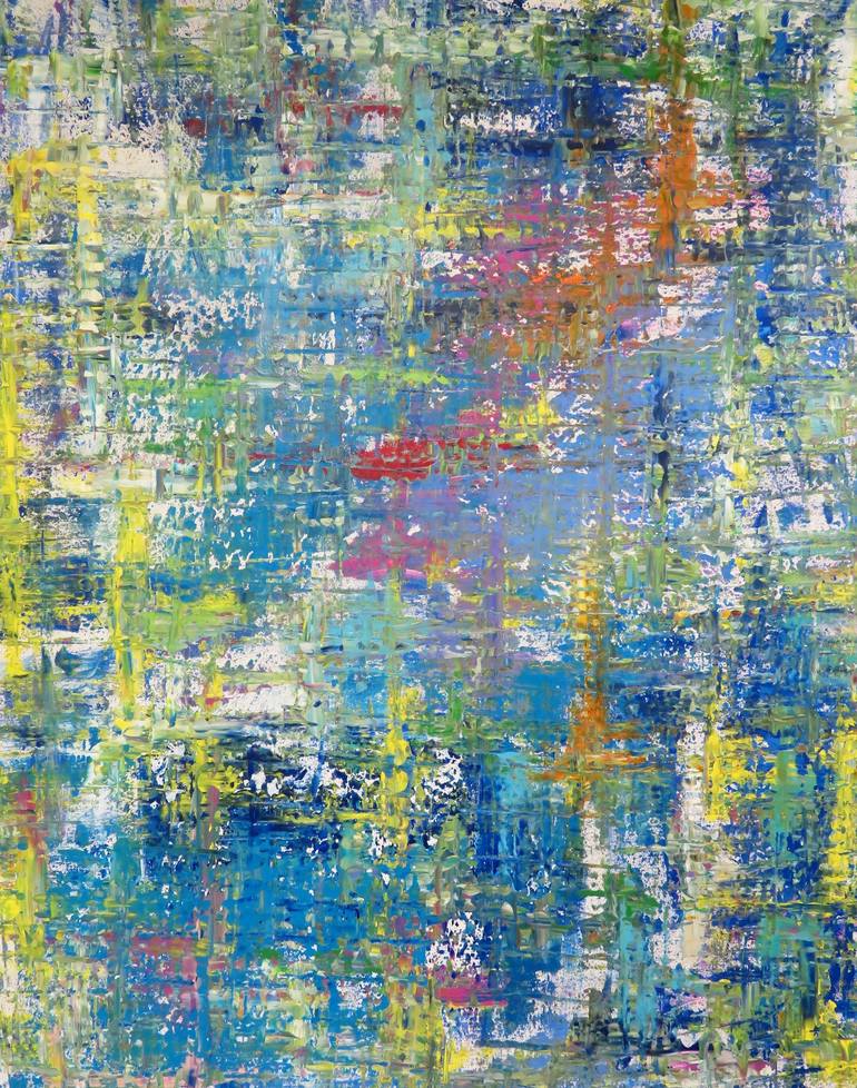 Abstract expressionist acrylic on stretched canvas. Large piece tries to capture the emotions of gardens, a common subject for the artist. Complex layers of saturated pigment with a medium amount of texture. Side edges are painted. Stretched, wired and ready to hang for display. Large format 58" x 4...