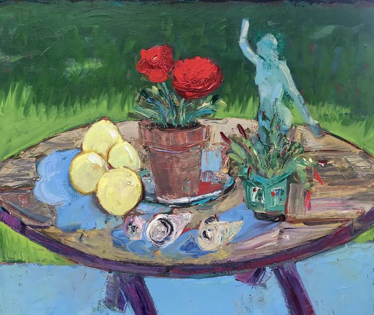 Inspired by a table in my garden as I found it. I hope the viewer feels a fresh feeling with the natural arrangement of the objects. I chose oils for the buttery textural qualities, aside from their pure colors