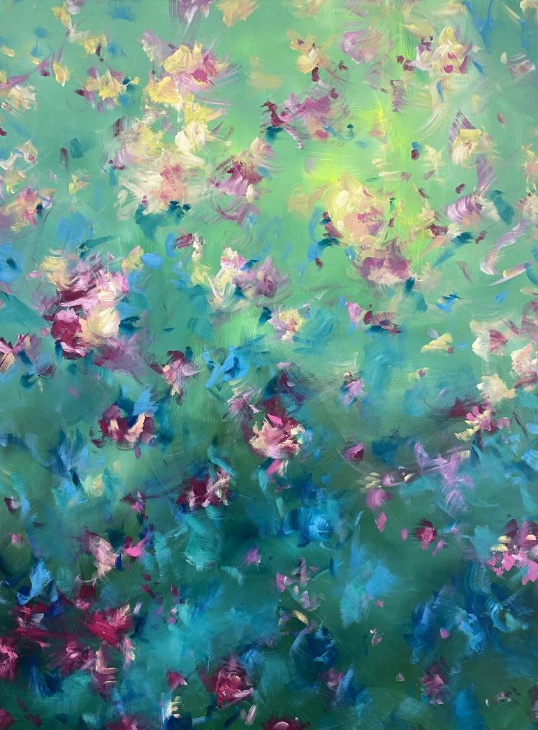 This large green abstract floral work is part of a series designed to evoke the feeling of floating with nature. Through flowing petals that dance and play, the work invites the viewer to experience a sense of lightness, as if drifting effortlessly through a lush, blooming landscape. The interplay o...